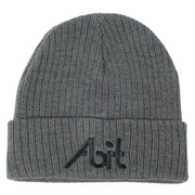 Rib knit cuffed beanie, proudly embroidered with the Abit logo. A comfortable blend of 50% recycled polyester and 50% acrylic. Charcoal gray, one size fits all.
