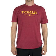 This shirt, by our friends at Dirtco, is a comfy blend of combed ring spun Cotton and Polyester. The artwork is a mellow yellow on Cardinal Red shirt color.